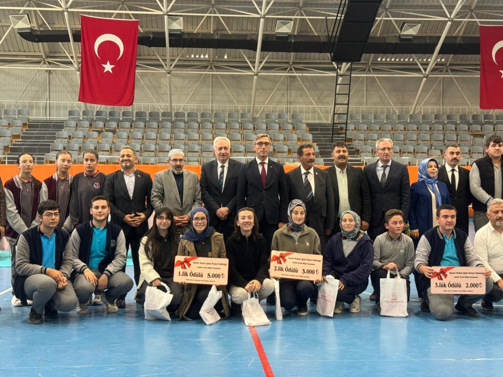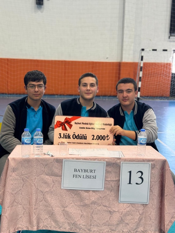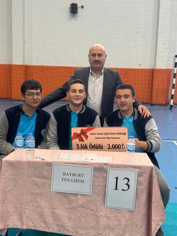 Ahilik Kültürü Haftası münasebetiyle düzenlenen faaliyetler kapsamında Bayburt Milli Eğitim müdürlüğü bünyesinde Bayburt İmam Erkek Hatip Lisesinin ev sahipliğinde düzenlenen yarışmada Bayburt Fen Lisesi olarak üçüncü olduk. Yarışmada okulumuzu edebiyat öğretmenlerimizin rehberliğinde öğrencilerimiz Akın Yusuf Söyüt, Mikail Albant ve Ahmet Gökkaya temsil ettiler. Yarışmanın 20 sorudan oluşan ilk bölümünde 19 soruya doğru cevap veren takımımız, üçüncülük için yarıştığı ikinci bölümde sorulan her soruya doğru cevap vererek üçüncü oldu. Üçüncülere verilen hediye ve 2000 TL’lik para ödülünü öğrencilerimize takdim eden Okul Müdürümüz Ömer Coşar başta öğrencilerimiz Akın Yusuf Söyüt, Mikail Albant ve Ahmet Gökkaya’yı; edebiyat zümresini tebrik etti, başarılar diledi.